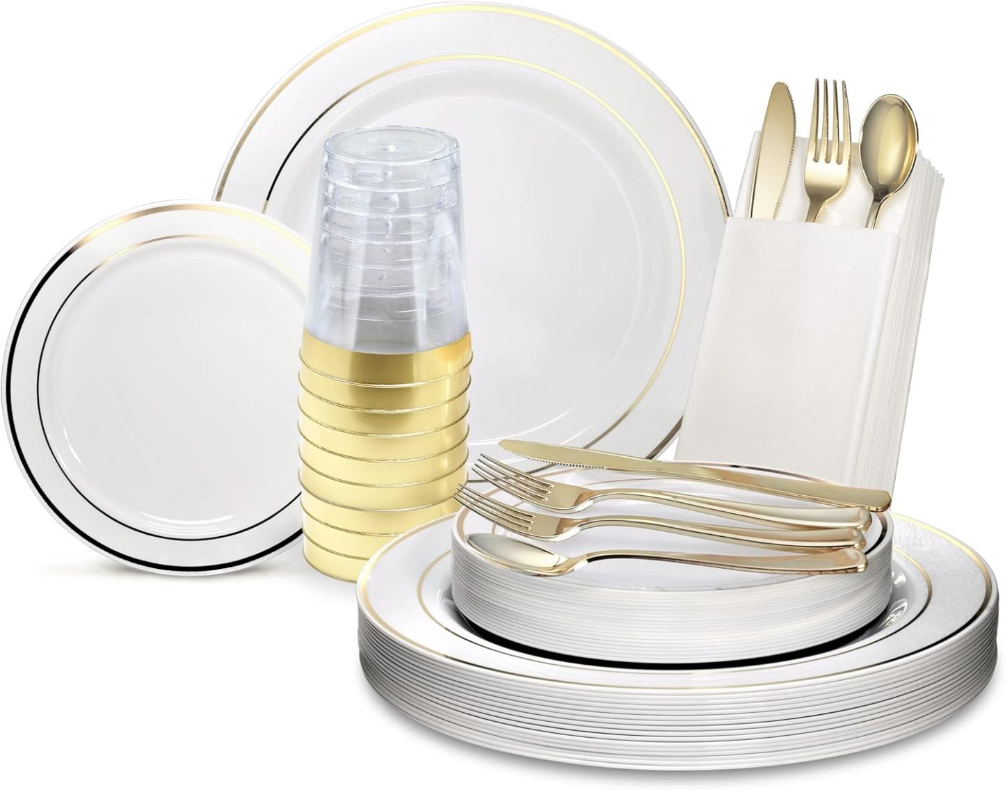 - 960 Pieces Set Pack Includes: 120 x 10.5'' Dinner Plate + 120 x 7.5'' Appetizer/Dessert plates, 240 forks, 120 spoons, 120 knives (Gold Coated), 120 x Prefolded Linen like paper napkins (white), 120 x 10oz tumblers